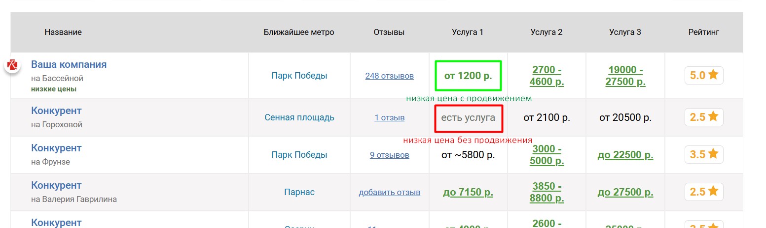 Вокруг продвигаемого таким образом центра выбирается некоторое количество ближайших конкурирующих центров, продвигаемый центр попадёт к ним в таблицу «Сравнение по ценам», которая выглядит следующим образом:
