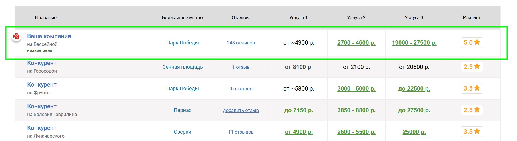 Иконка 16х16 пикселей будет отображаться слева от названия вашего центра в таблицах, выделяя его среди прочих. Опция увеличивает вероятность перехода на страницу компании и рекомендуется в качестве дополнения к прочим методам продвижения, в первую очередь для центров с узнаваемым брендом.